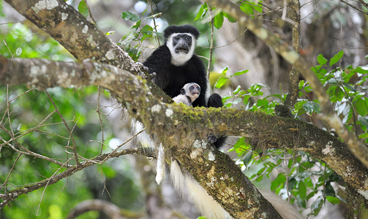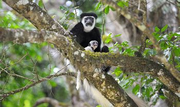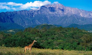 Located just 40kms from Moshi, this is one of the most beautiful parks in Tanzania.  It is remarkable for its range of different habitats….a miniature volcanic crater, highland rainforest, acacia woodlands, and a string of crater lakes (Momella Lakes).  Its three most spectacular features are these Momella Lakes, Meru Crater, and Ngurudoto Crater.  In addition, on a clear day, this park offers spectacular views of both Mt. Meru and Mt. Kilimanjaro.  Due to its close proximity to Moshi and Ameg Lodge, this park can be visited as a day excursion or an overnight stay.  A wide variety of wildlife can be spotted here…various antelopes, buffalo, hyena, leopard, baboon, giraffe, elephant, hippo, and a wealth of bird life.  The black and white colobus monkey is a favourite and is easily spotted here.